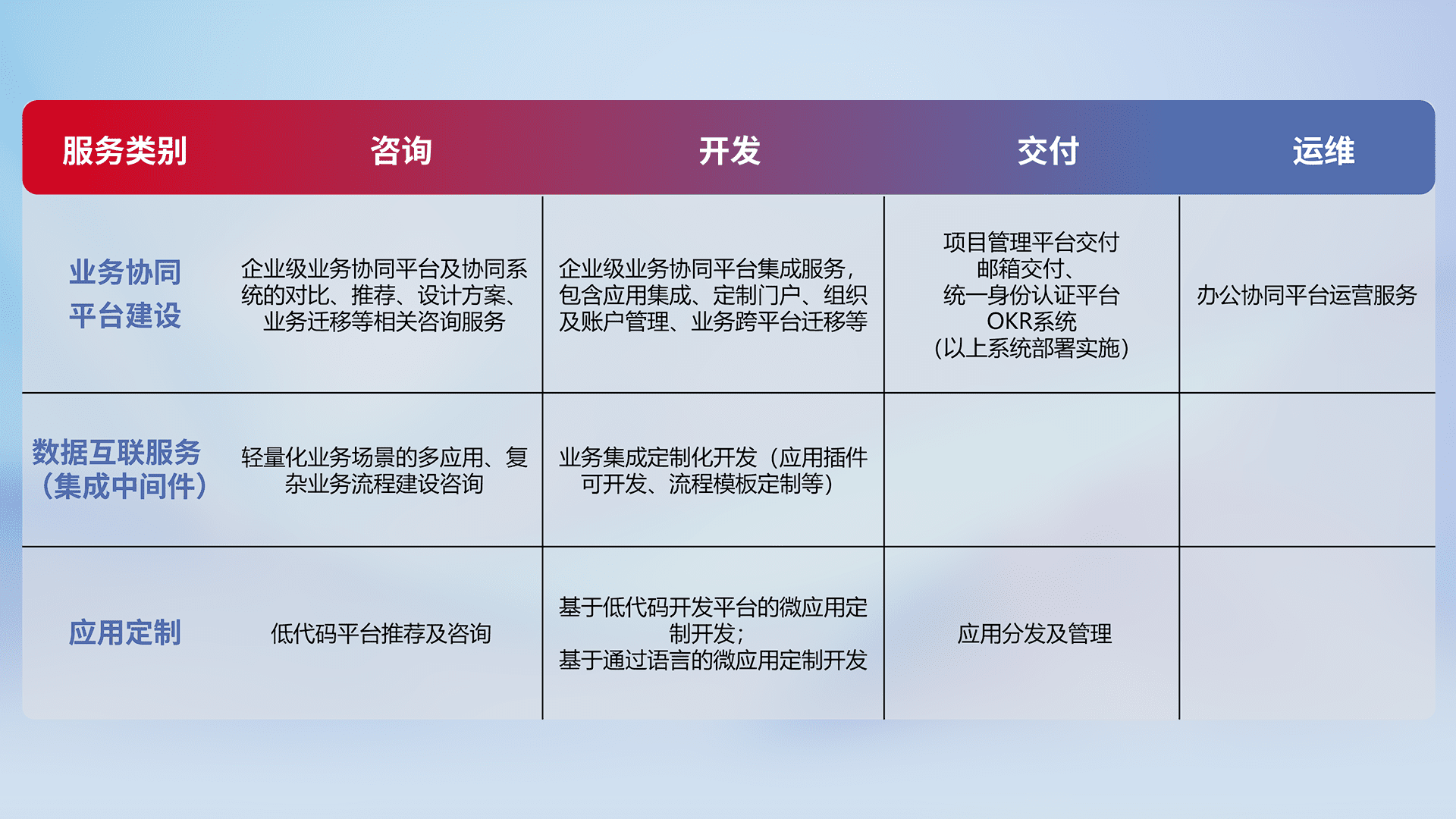 针对钉钉、、、、企微、、、、IDaas等平台级产品提供产品的规划、、方案、、、交付、、、、定制化开发等服务,,实现如统一协同办公、、、、智能客户服务、、、混合会议管理、、、、智能数据查询、、、、等业务场景,,,实现数字化转型。。